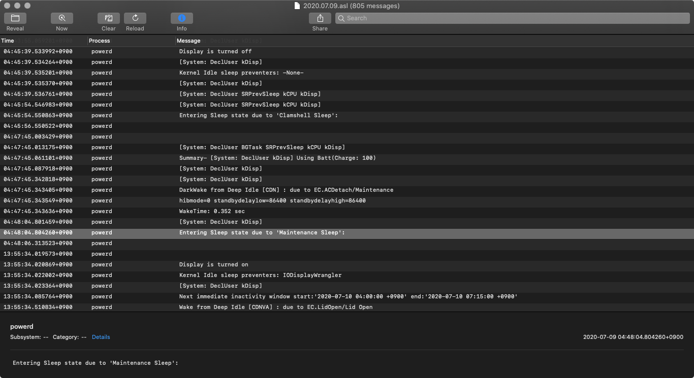 Sleep/Wakes since boot at 2020-07-09 16:13:29 +0900 :2 Dark Wake Count in this sleep cycle:1