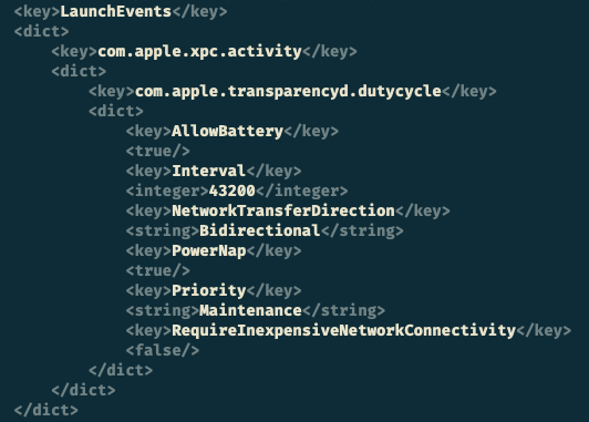 調べてみると、AllowBatteryがtrue、PowerNapがture、PriorityがMaintenanceに設定されているものは4つ見つかりました。