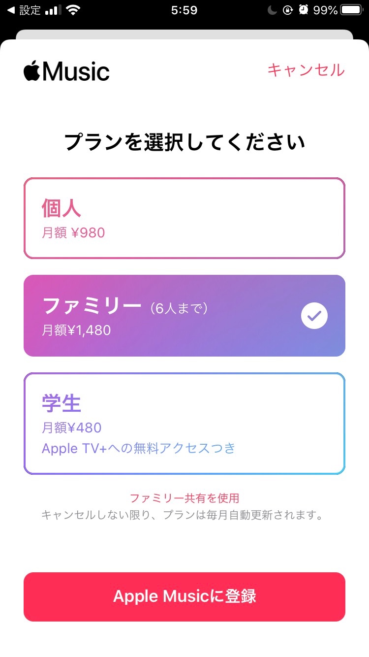 個人契約していたアップルミュージックを解約後ファミリー共有で利用できるようにしたい