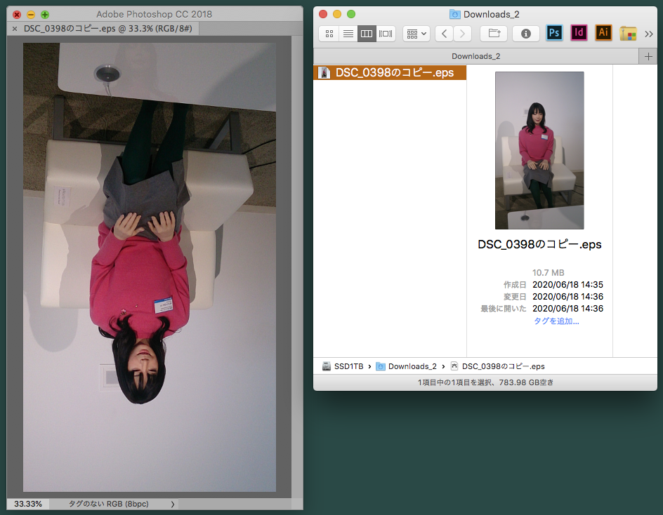 MacBookPro13inch(early2011)にて、OSをSierraからHighSierra(10.13.6)にアップグレードしたところ、Finderでのepsファイルの表示が上下反転するという現象が起きました(スクリーンショット参照)。アイコンの画像・アイコンプレビュー・クイックルックの画像いずれも反転しています。フォトショップ・イラストレータいずれのepsファイルも反転しています。ファイルをアプリケーションで開けば正常に表示されますので、Finder上だけの現象のようです。jpgやpsdなど他のファイル形式の表示は問題ありません。eps保存時のオプションをいくつか変えてみても同じでした。 原因・対処法など何かご存知の方いらっしゃいましたら、おしえていただけると幸いです。よろしくお願いいたします。