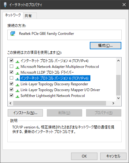 イーサネットのプロパティーで、「インターネット プロトコル バージョン6(TPC/IPv6)」のチェックを外す。