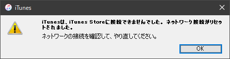 その状態がしばらくたった後に、「iTunesは、iTunes Storeに接続できませんでした。ネットワーク接続がリセットされました。ネットワークの接続を確認して、やり直してください。」のダイアログが表示されます。