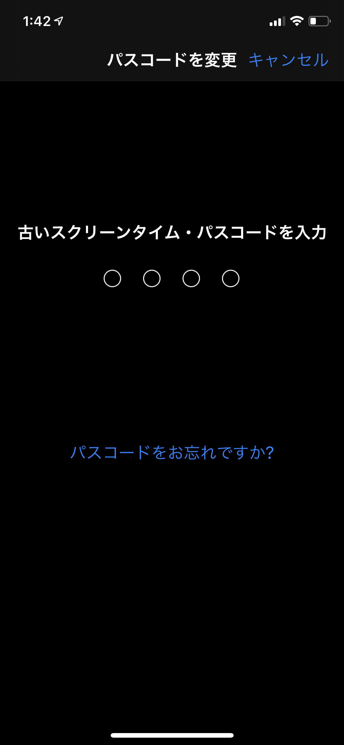 「スクリーンタイム・パスコードを変更」というものがあり、それを押すと4桁の番号をいれさせられるのですがその画面中央に青文字で、「パスコードをお忘れ