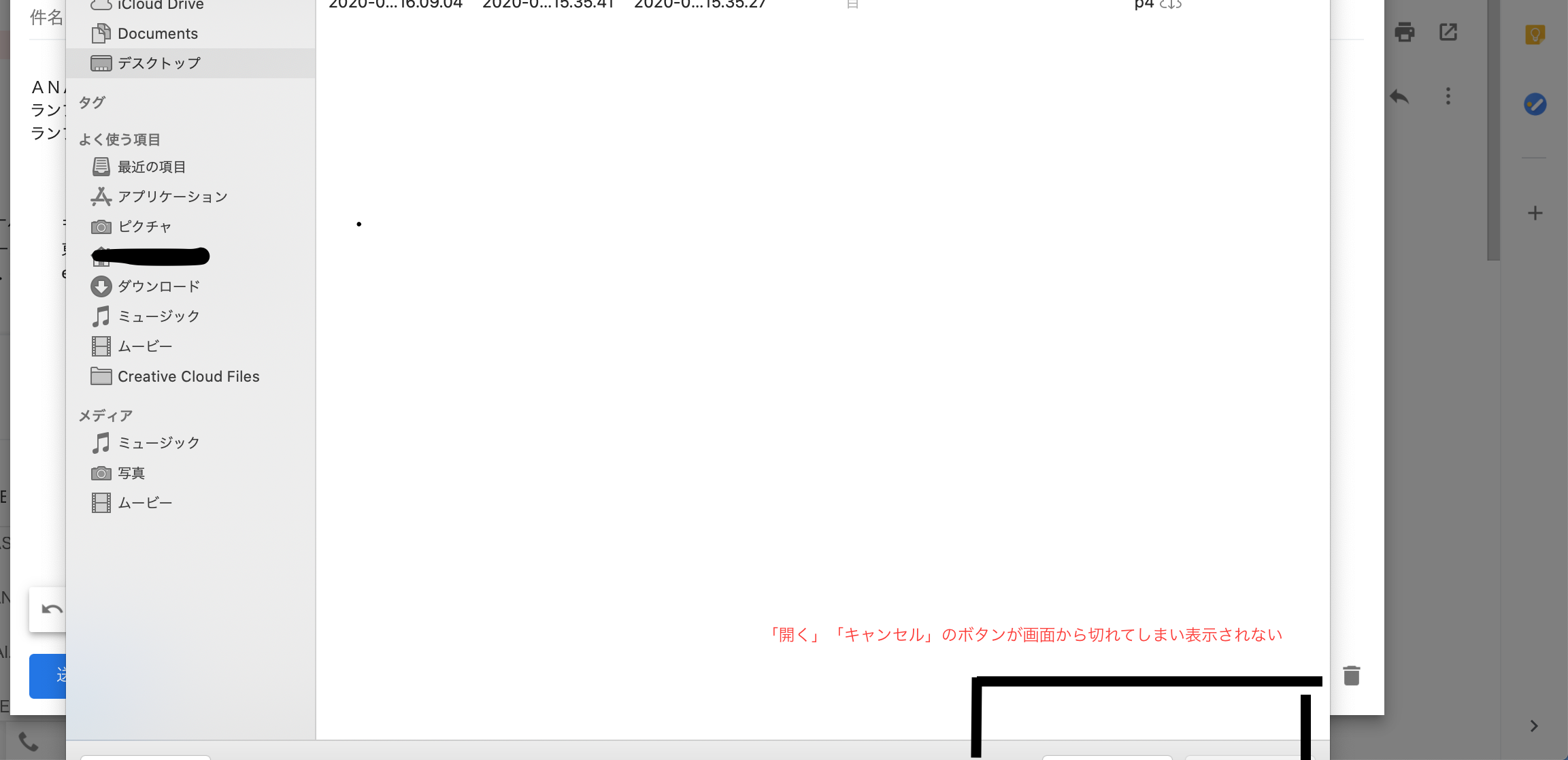 その際に表示されるダイアログの画面サイズが大きすぎて「開く」「キャンセル」のボタンが隠れてしまい、ギリギリ画面に表示されている状況で、押下できず困っています。
