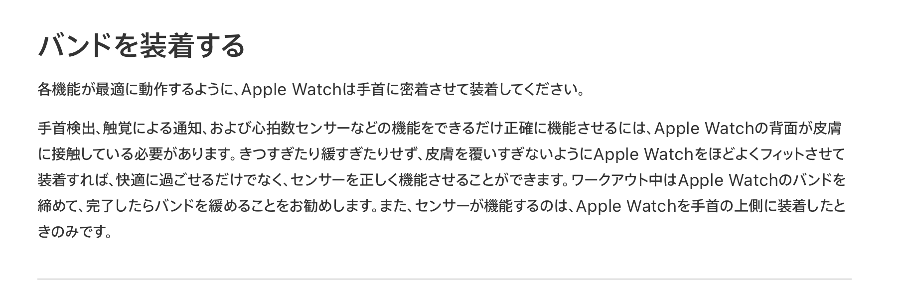 一般的な腕時計との違いは、腕を動かしてもWatchが動いたり回転したりしない程度にやや強めに締める、という点でしょう。