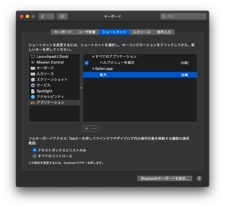 1. 「システム環境設定」>「キーボード」>「ショートカット」>(左リスト上の)「アプリケーション」を選択し、続けて「+」ボタンをクリック