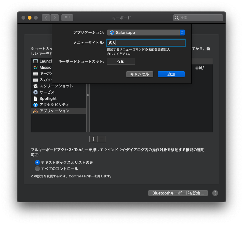 例)Safariの「拡大」のショートカットを Shift+⌘+; に変更(結果的に押し方は「⌘」+「Shift」+「+」と同じです)