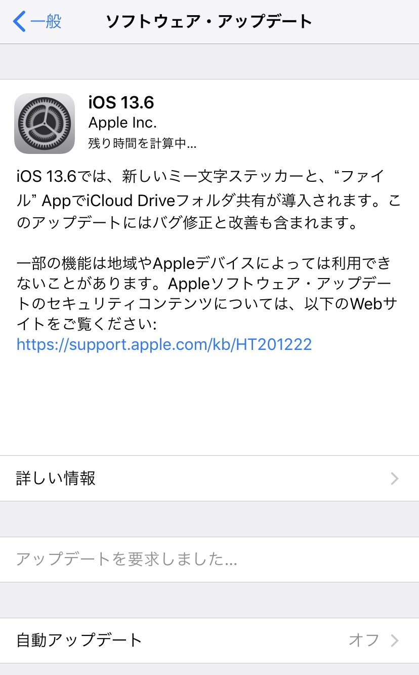 その後、再びWi-fiに接続しソフトウェア・アップデートからアップデートを行おうとするが、「アップデートを要求しました」「残り時間を計算中」から進まないという現象が1週間ほど前から続いている。