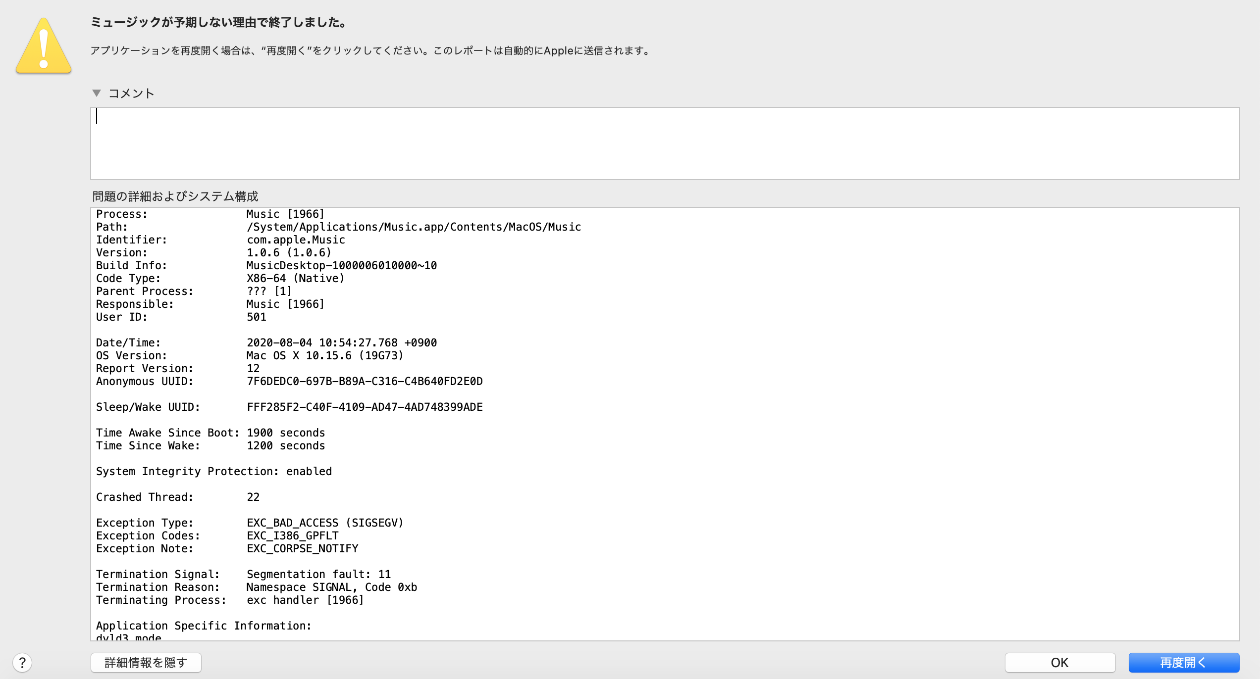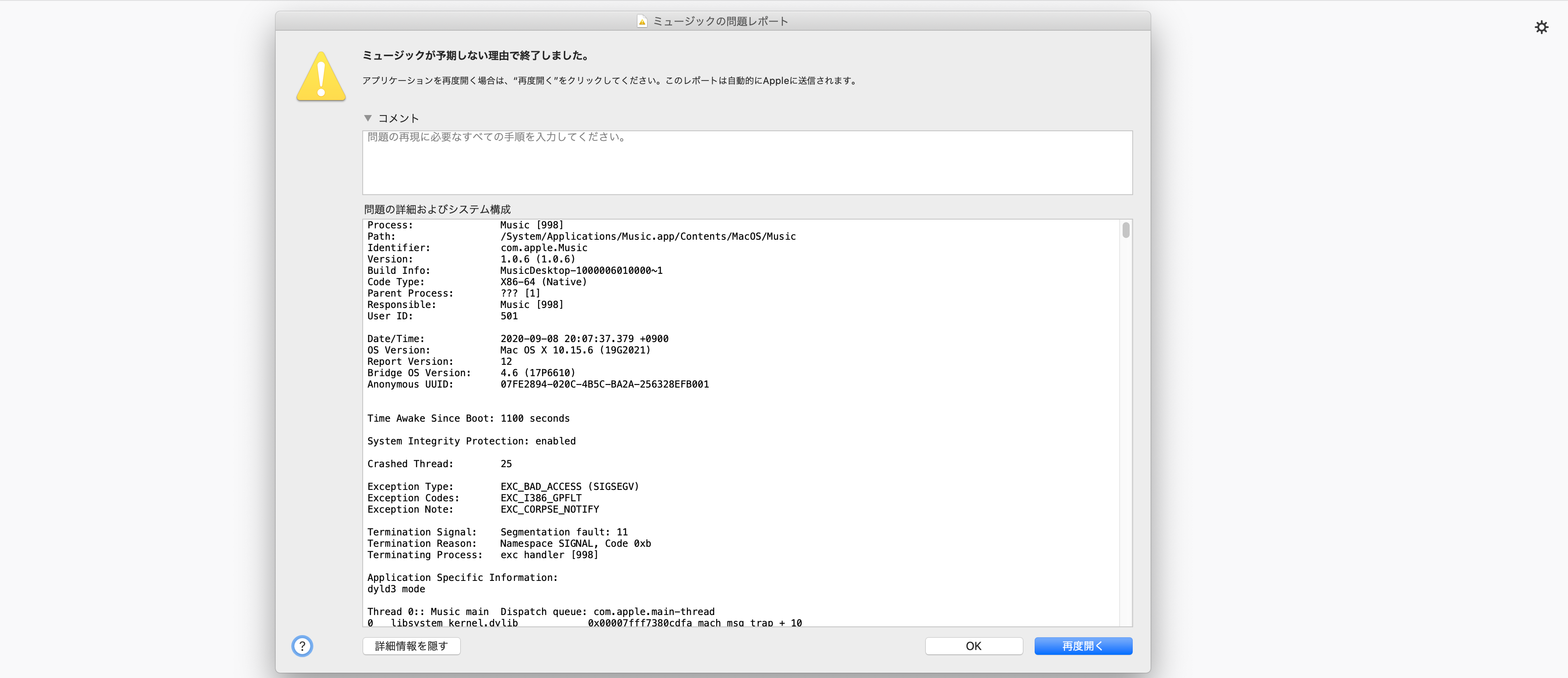 私の場合も1曲ほど再生するとMUSICが下記のエラーと共に終了します。。