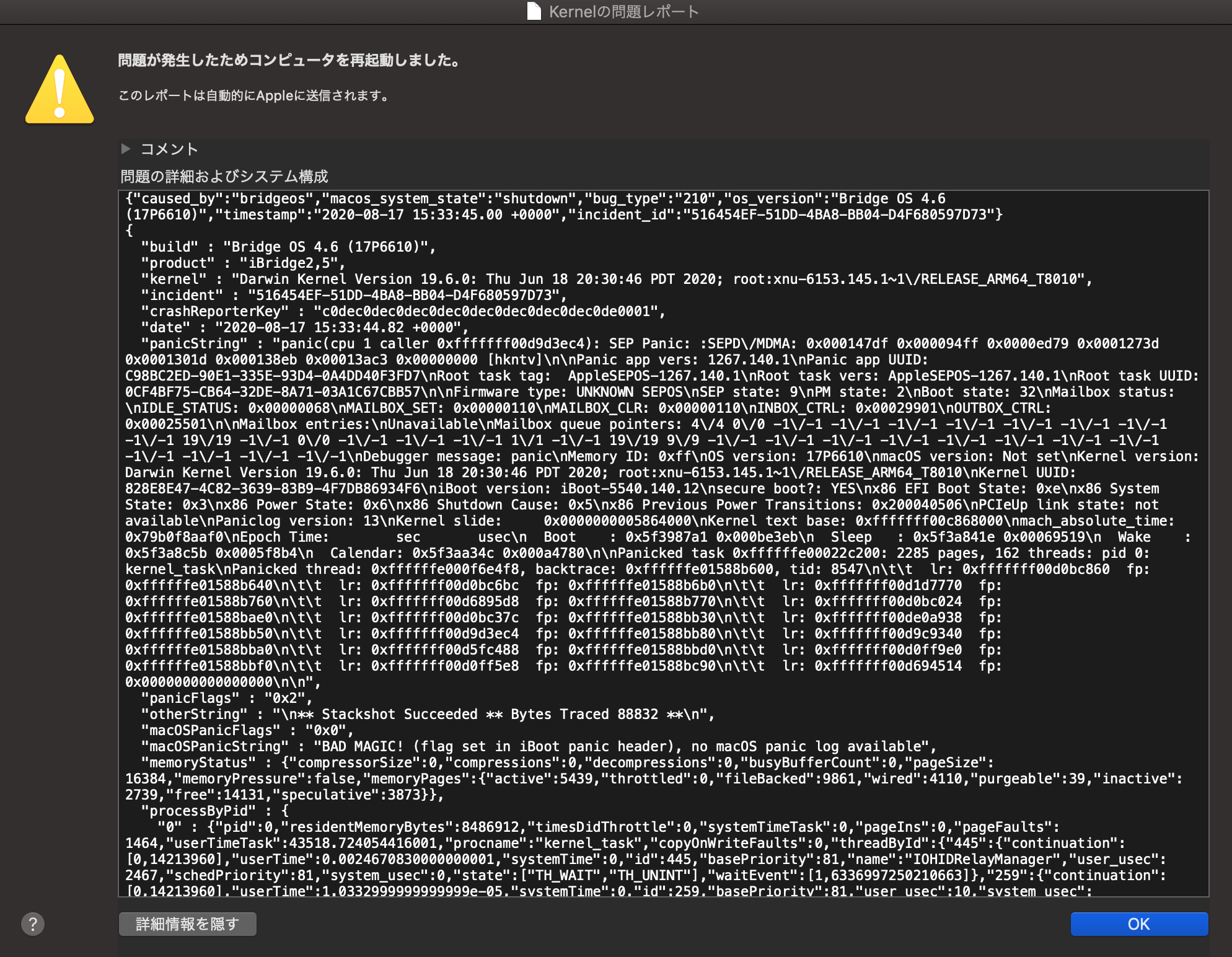 一方、起動時に再起動エラーが出ています。レポート送信=OKで詳細はAppleに送信しています。