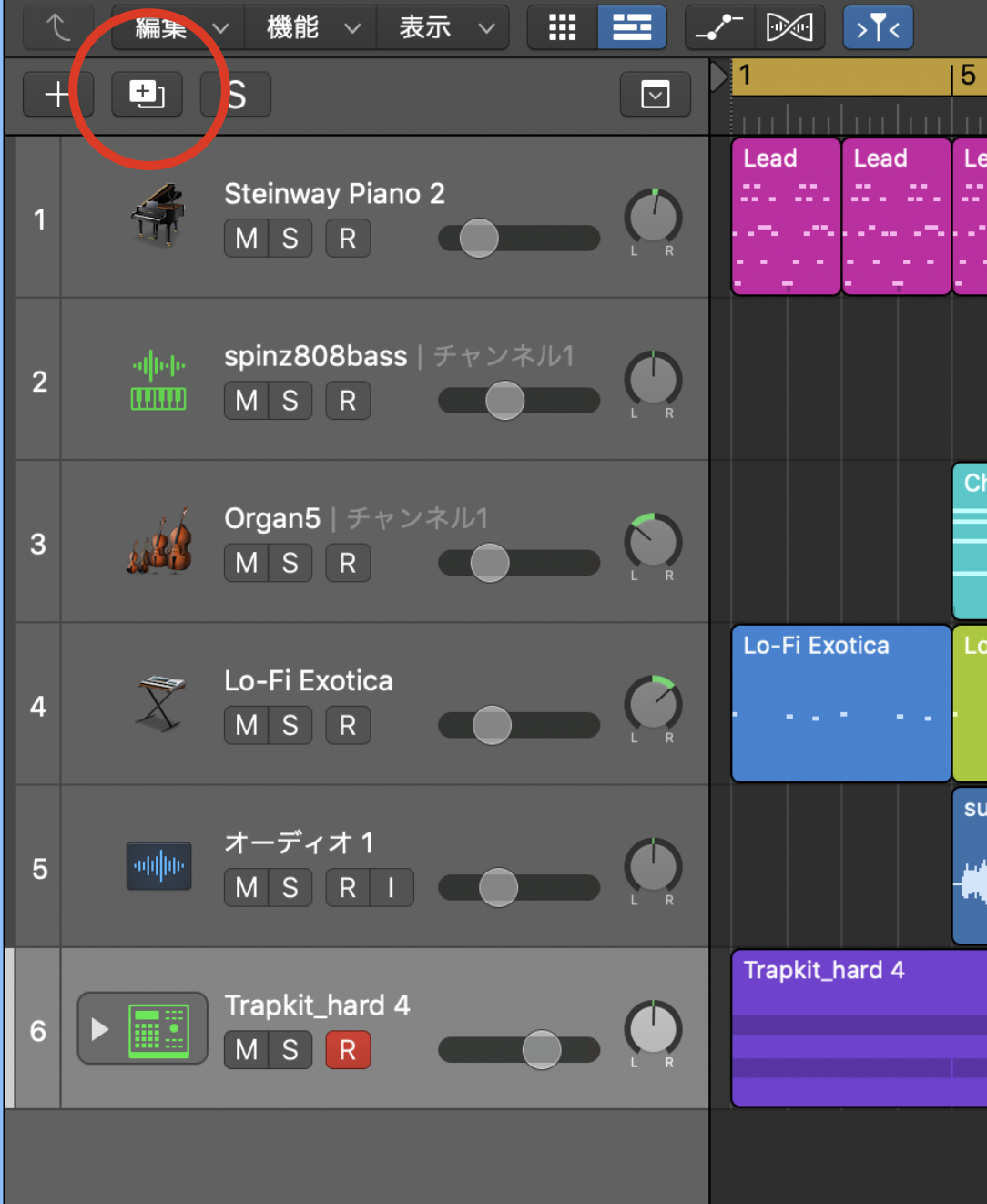 みなさん知っていると思いますがコピーしたいトラックを選択したあと、この赤丸をクリックすれば同じ設定のトラックが追加になりますので1テイクごとに別トラックでとった後コピペかMIDIリュージョンを切りはりが一番ベストでは?