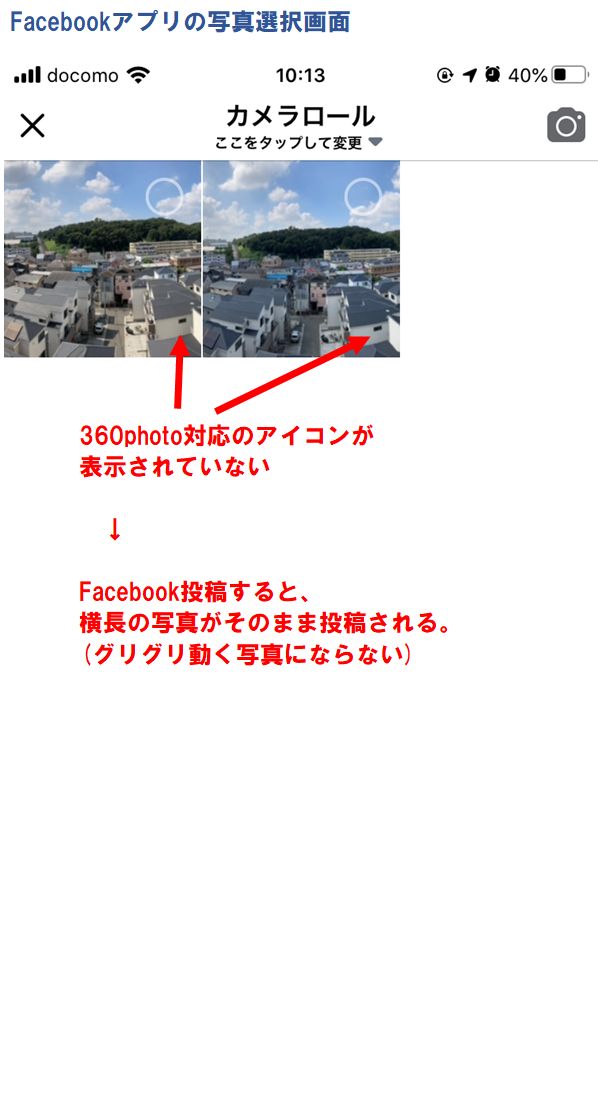 Facebookアプリでパノラマ写真選択する画面ですが、本来写真の右下にアイコンが出るはずなのですが、