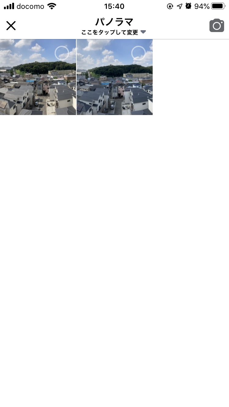Facebook アプリの写真選択画面で、「パノラマ」の項目に切り替えることができます。(写真1枚目)