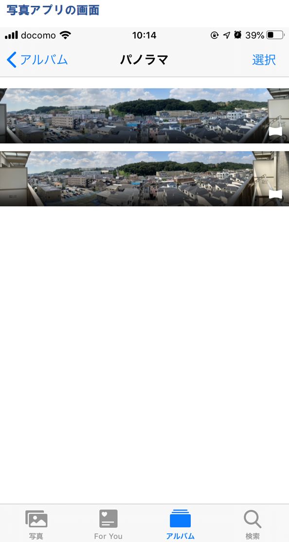 ・撮影した写真は「写真 App」> 画面下側の「アルバム」>メディアタイプの「パノラマ」に存在していますか。
