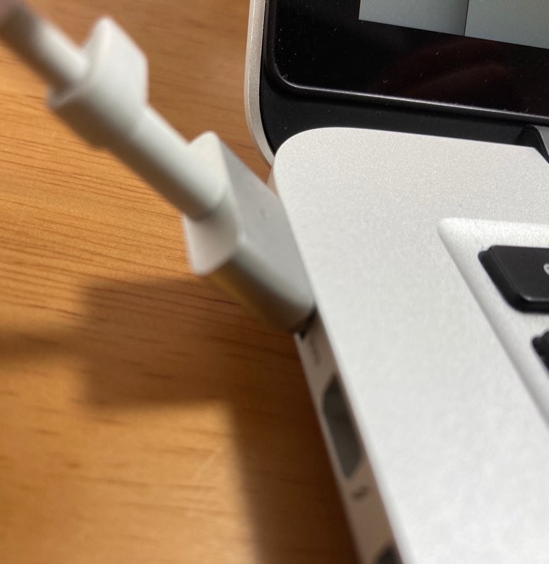 2.MagSafe 2コネクタとMacのコネクタ接続部分の上部を合わせる(写真)。