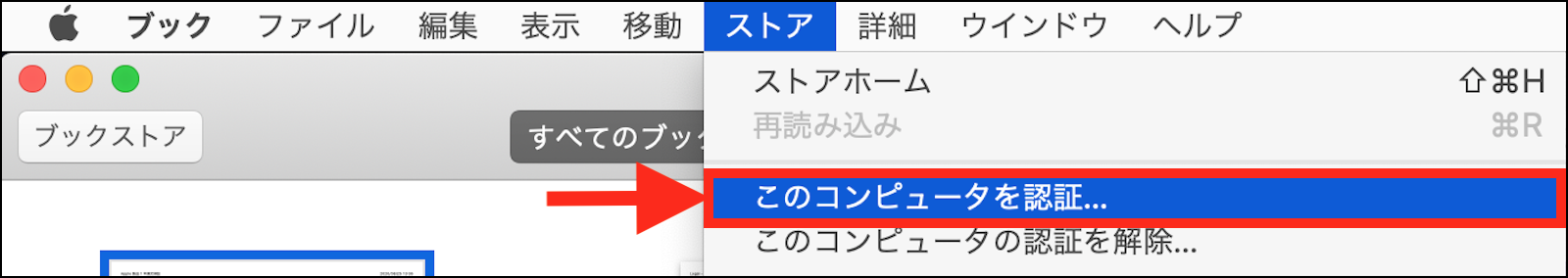 別のコンピュータや、iPhone、iPad、iPod touch 等からコンピュータを認証する事は出来ませんので、認証したい Mac で「ブック.app」を起動し、下の画像の様に、「ストア」メニュー >「このコンピュータを認証」の項目を選択して認証 出来ませんでしょうか?