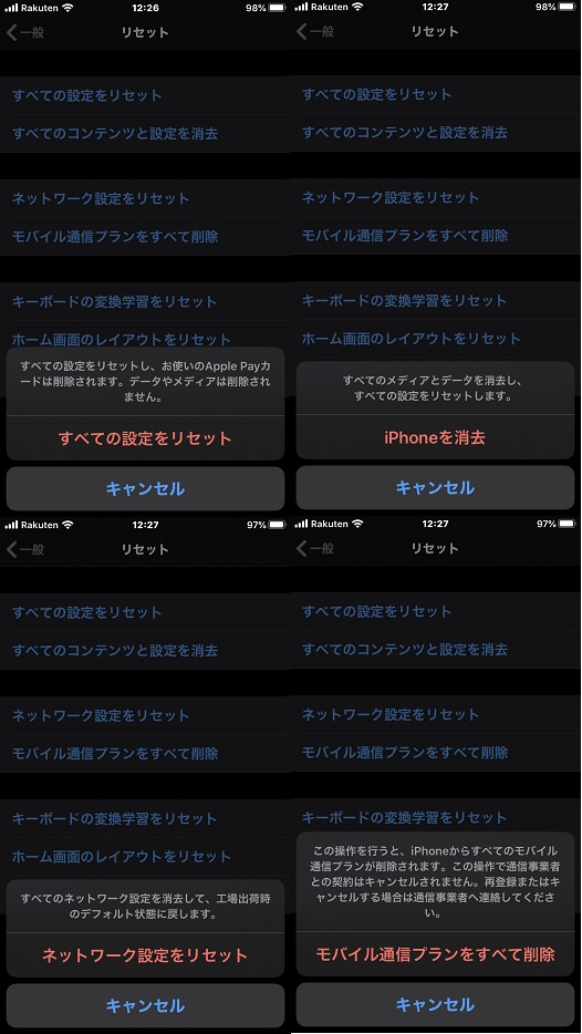 iPhone SE(2020) iOS13.7ですが、eSIM情報(Rakuten)を残したままリセットする方法で、