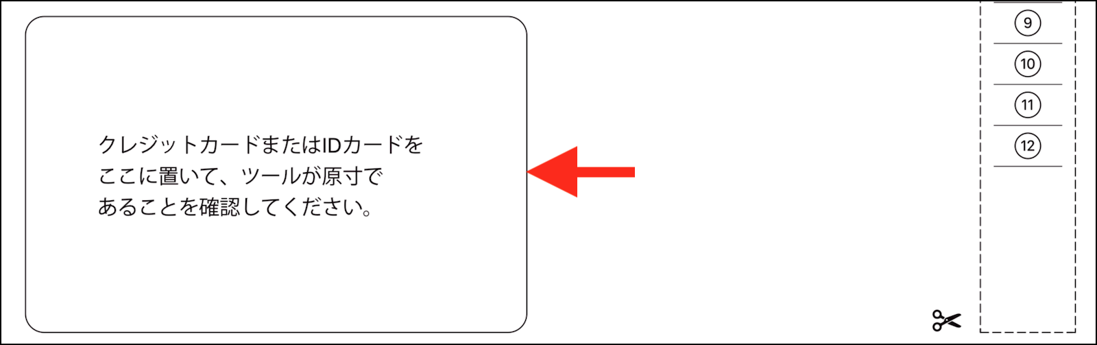 下の画像の様に、印刷したサイズガイドが原寸サイズ(100 %)で印刷されているかの確認用に、カードを置いて比較する部分が有りますが、実際にカードを置いて、サイズガイドが原寸サイズ(100 %)で印刷されている事を確認 されましたでしょうか?