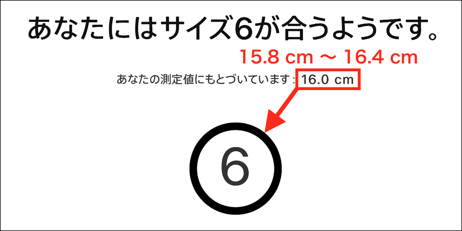 下の画像の様に、手首のサイズが 16 cm(15.8 cm 〜 16.4 cm)であれば、バンドサイズは「6」 になるはずです。