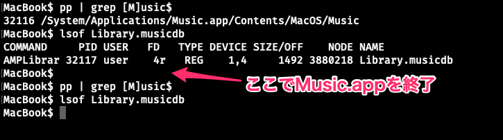 ターミナルで「sudo lsof (ボリューム)」と打ってみたところ、「AMPLibrar」というプログラムが使用しているようですが、身に覚えがありません。