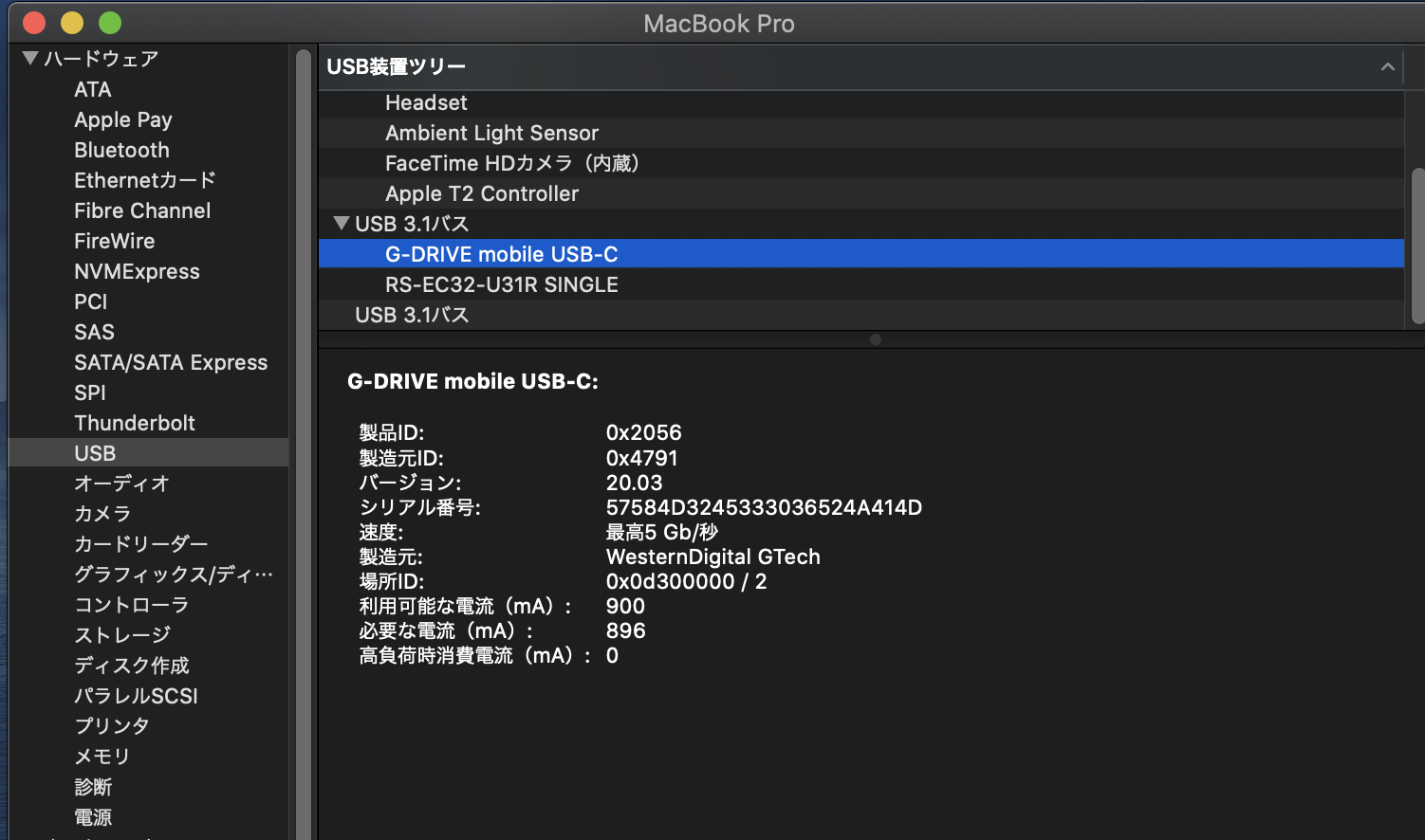 これで見ると、G-Drive mobile usb-cの製造元idは 0x4791、製品idは0x2056ですね。