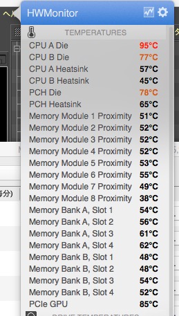 どれがヒートスプレッダの温度を示すかわかりませんがHMMonitorとMac Fan Controlの表示を添付します。