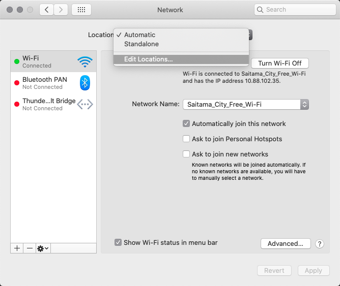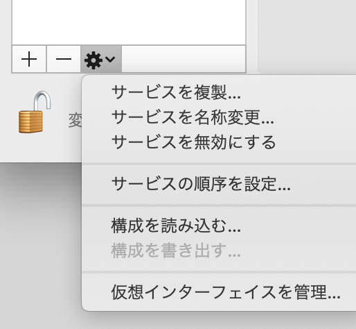 いろいろ探っていると「システム環境設定」の「ネットワーク」から歯車⚙の▽をクリックすると「仮想インターフェイスを管理」