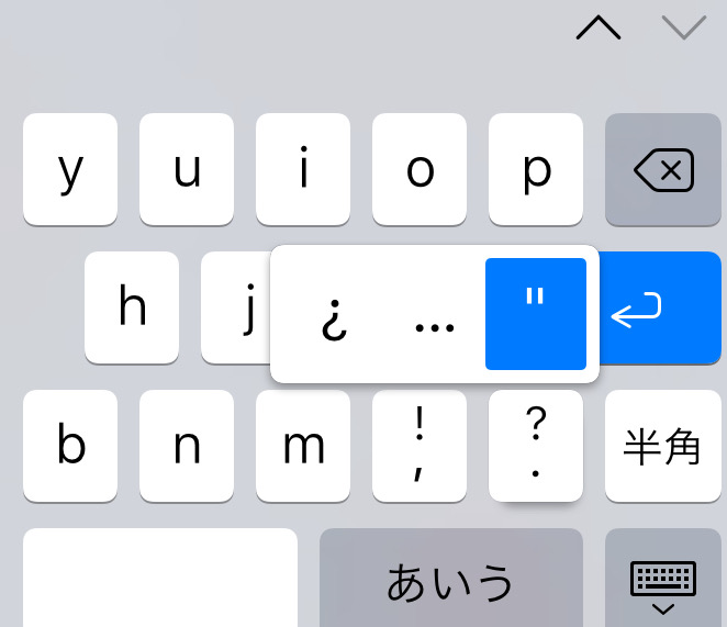 キーボードを出現させ「?」をタップすると、画像のように選択肢に出てくる「?」は逆さまの逆疑問符「¿」になってしまい、普通の「?」が入力できません。