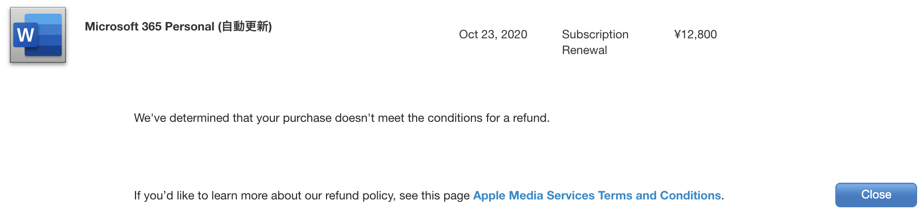 利用開始から間もなく諸事情で解約することにし、Microsoft サポートセンターに問い合わせたところ