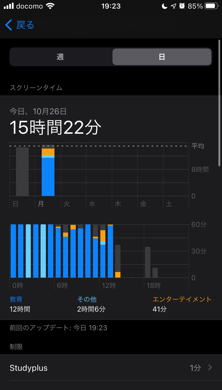 ・使用実績の表示がおかしくなっているのは発生している端末のみで、他の端末から該当端末のスクリーンタイムレポートを見るとおかしくなっていない使用実績が表示される