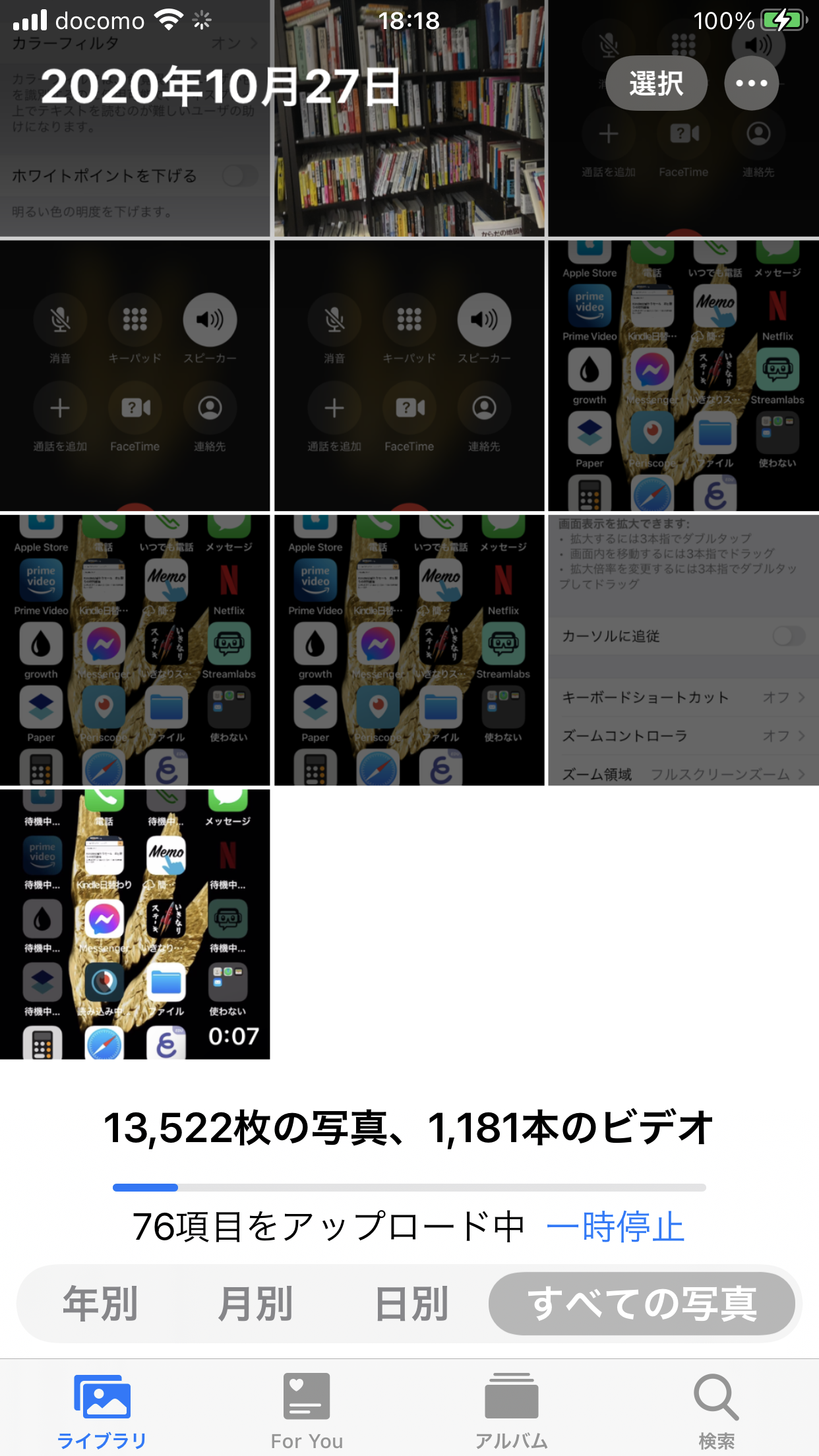 そして、結論としてこの設定>アクセシビリティ>ズーム>ズームフィルタ>低照度の設定を「なし」にすると、その瞬間から画面が明るくなり、スクショすると以下のように正常に明るいスクショになりました。(わかりにくいかもしれませんが、写真アプリの画面をスクショしています。なので試して何度も撮った暗い写真が写っていますが、下の方は明るいですよね。)