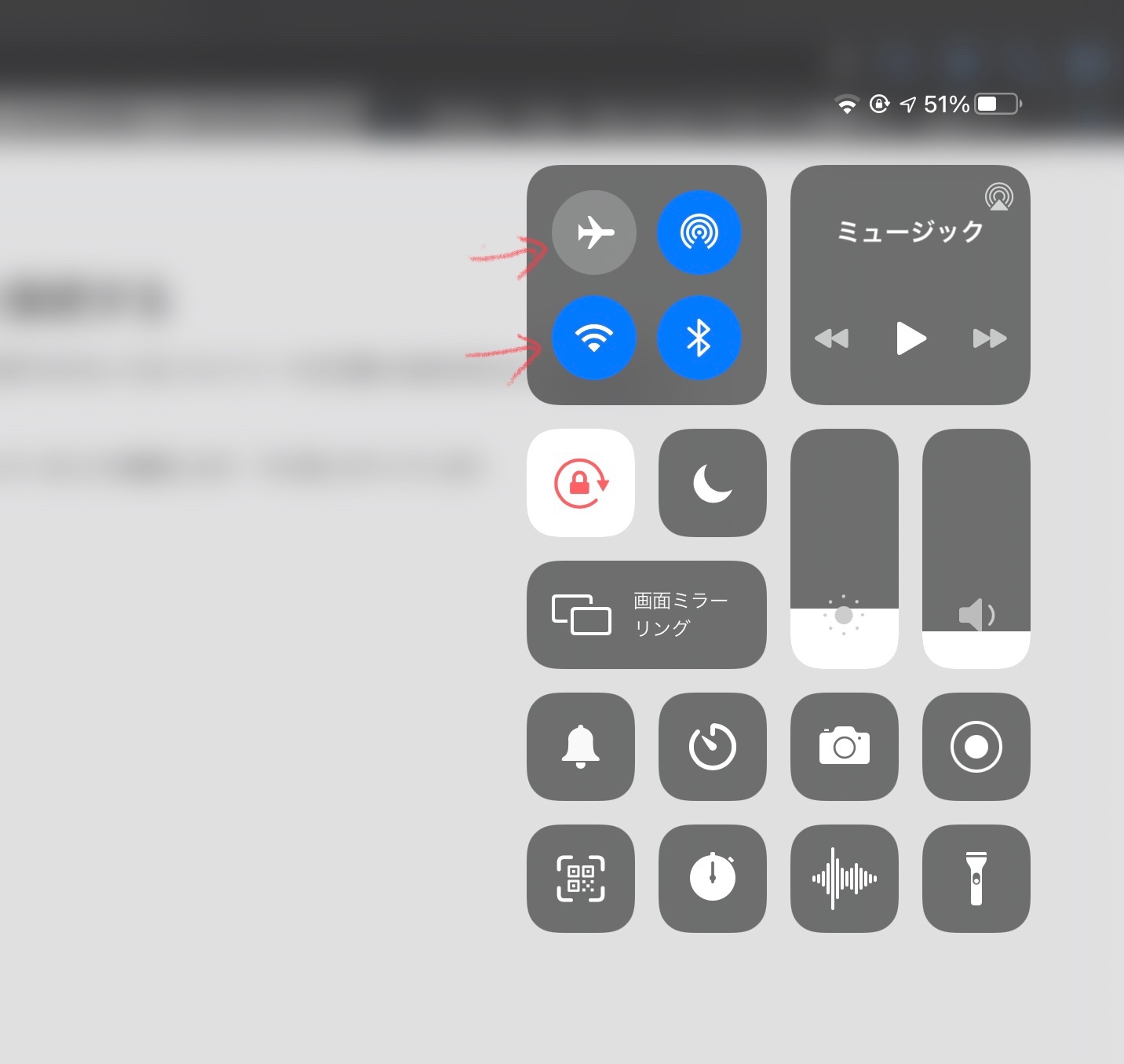 この飛行機のボタンを押すと機内モードで、通信ができなくなります。この扇型のマークはWifiのオンオフです。