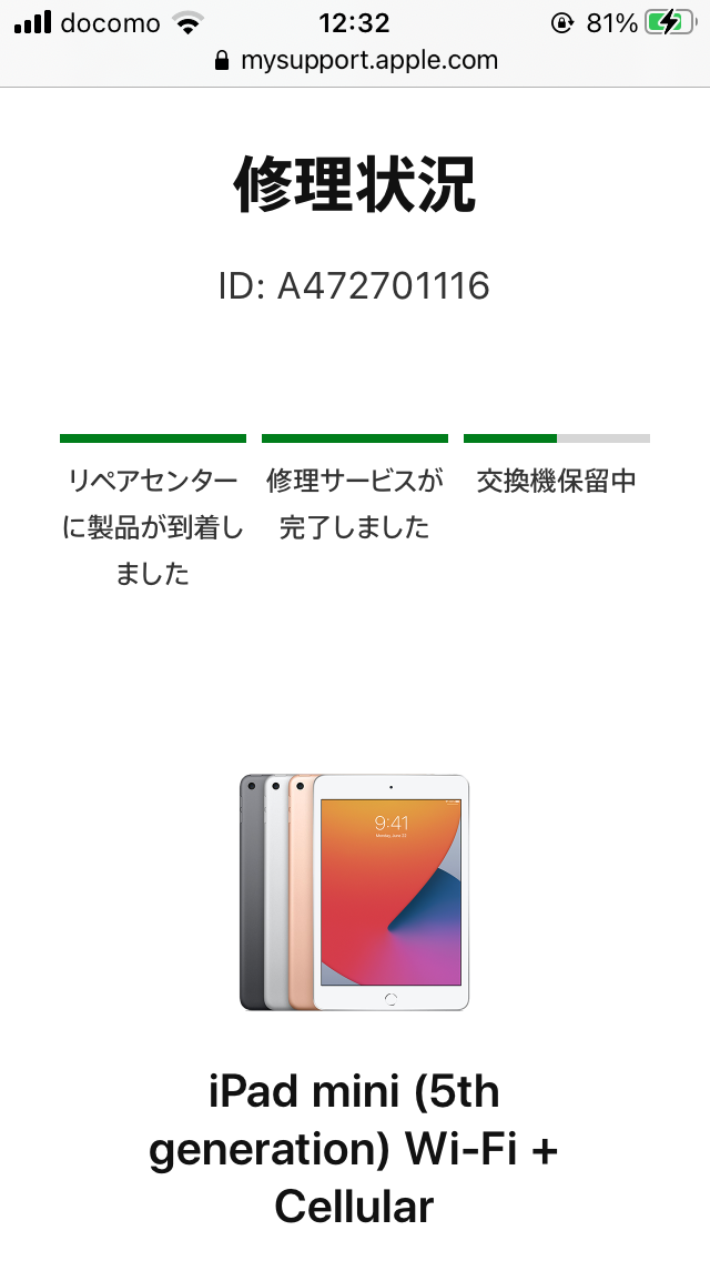 「修理の詳細」では、Apple リペアセンターに届いたその日に修理が完了した事になっており、「修理状況」でも確かに iPadmini5user さんがお書きの様に、「修理サービスが完了しました」の後に「交換機保留中」になっていますので、これではユーザは混乱してしまいますよね。