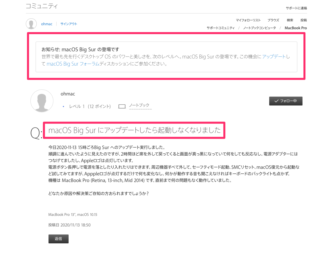 また cocooncocoon 様は、「1ヶ月ほどBig Surで使えており急にある日突然起動音は鳴るものの真っ暗状態です。」とのこと。