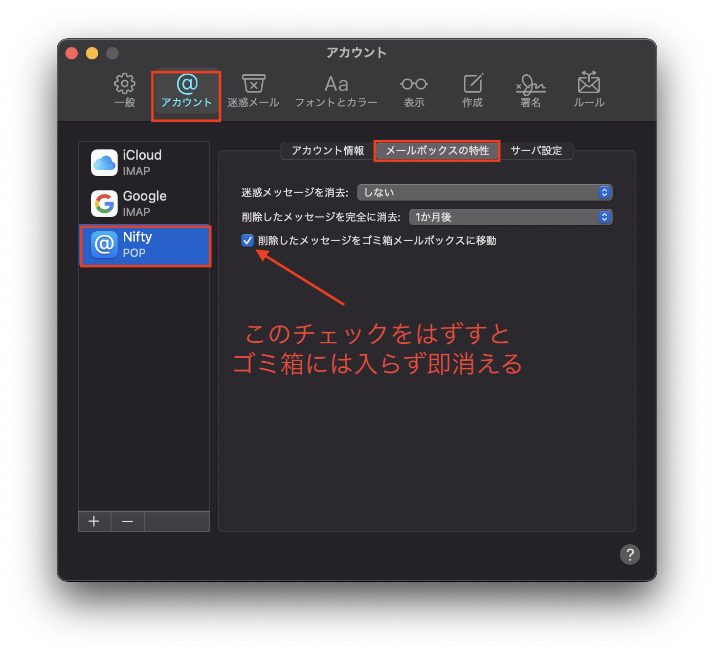 ●<削除したメッセージをゴミ箱メールボックスへ移動>はチェックが入っています。