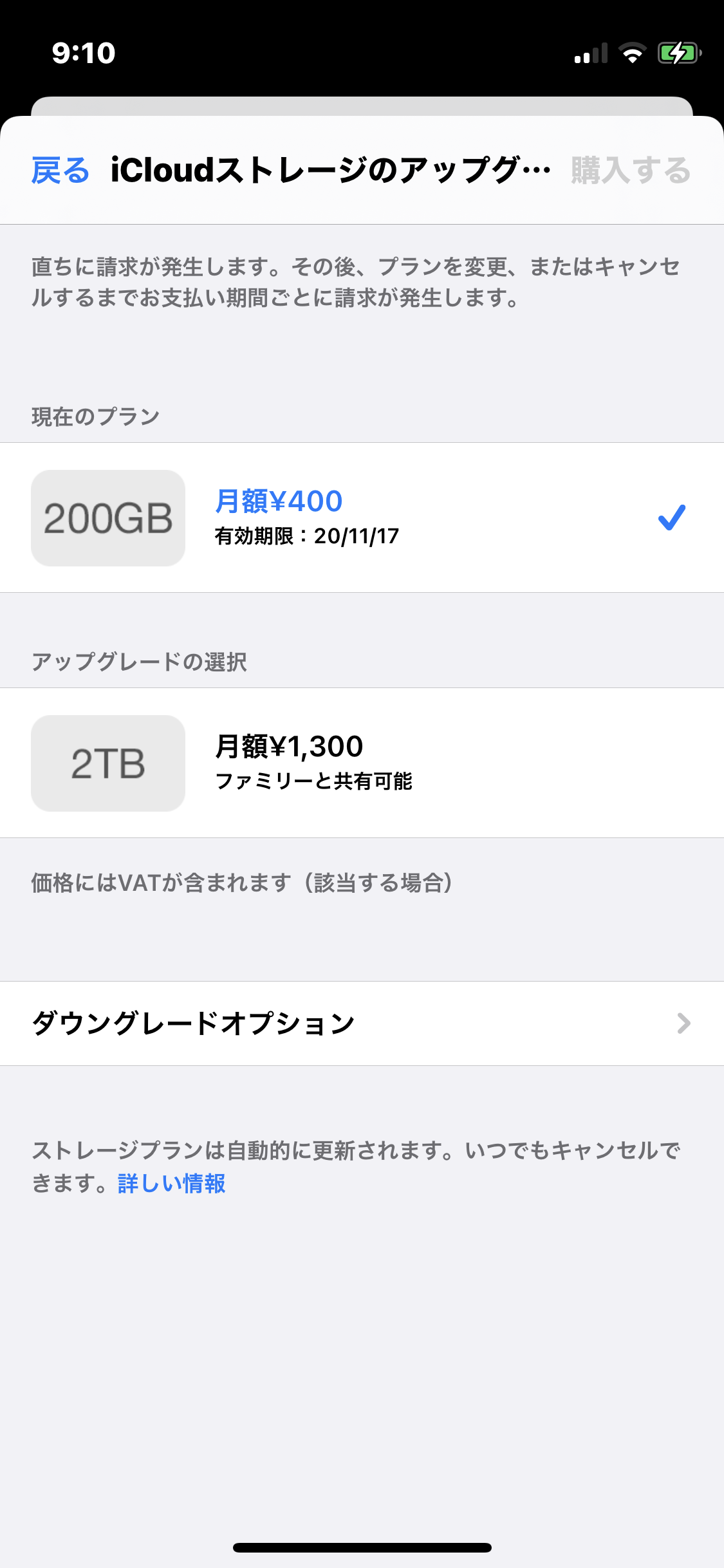 ダウングレードオプションのところを開くと5GBのところの無料の文字が青文字になってるのですが、現在のプランのところには200GBのプランが表示されています。
