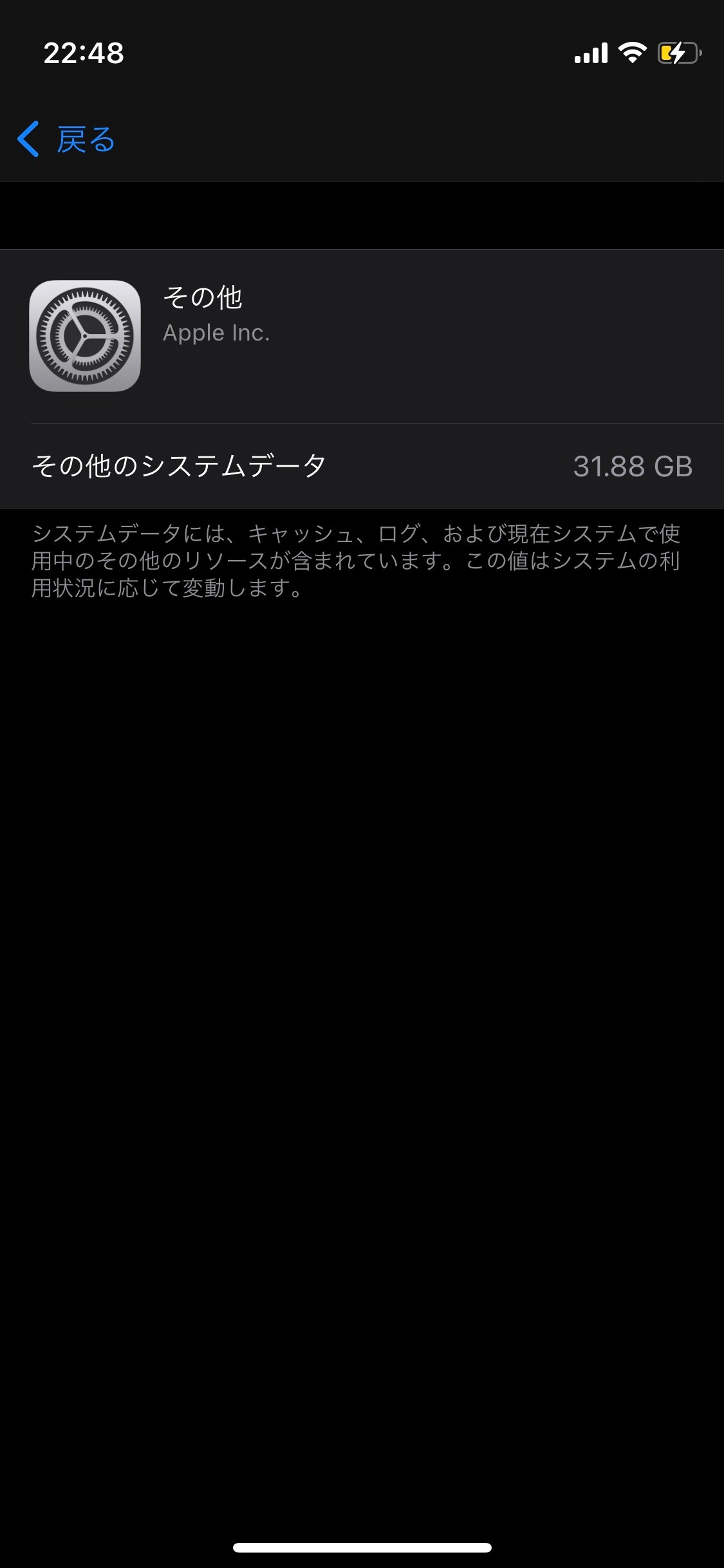 なので、どこが一番大きなファイルなのかを「設定」のiPhoneストレージで確認したところ、一番下(「システム」の下。設定アイコン)の部分の容量が非常に大きかったです。