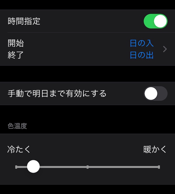 ”オン”にしている時には、画面の"色温度”を調整することができます。