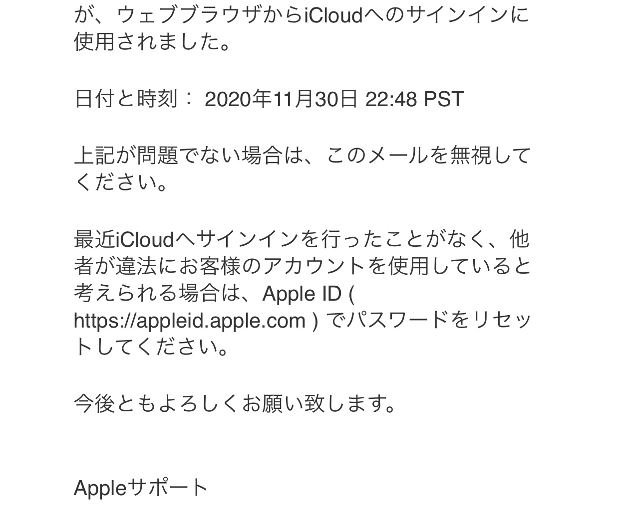 ) が、ウェブブラウザからiCloudへのサインインに使用されました。日付と時刻: 2020年11月30日 22:48 PST上記が問題でない場合は、このメールを無視してください。最近iCloudへサインインを行ったことがなく、他者が違法にお客様のアカウントを使用していると考えられる場合は、Apple ID (https://appleid.apple.com ) でパスワードをリセットしてください。今後ともよろしくお願い致します。Appleサポート