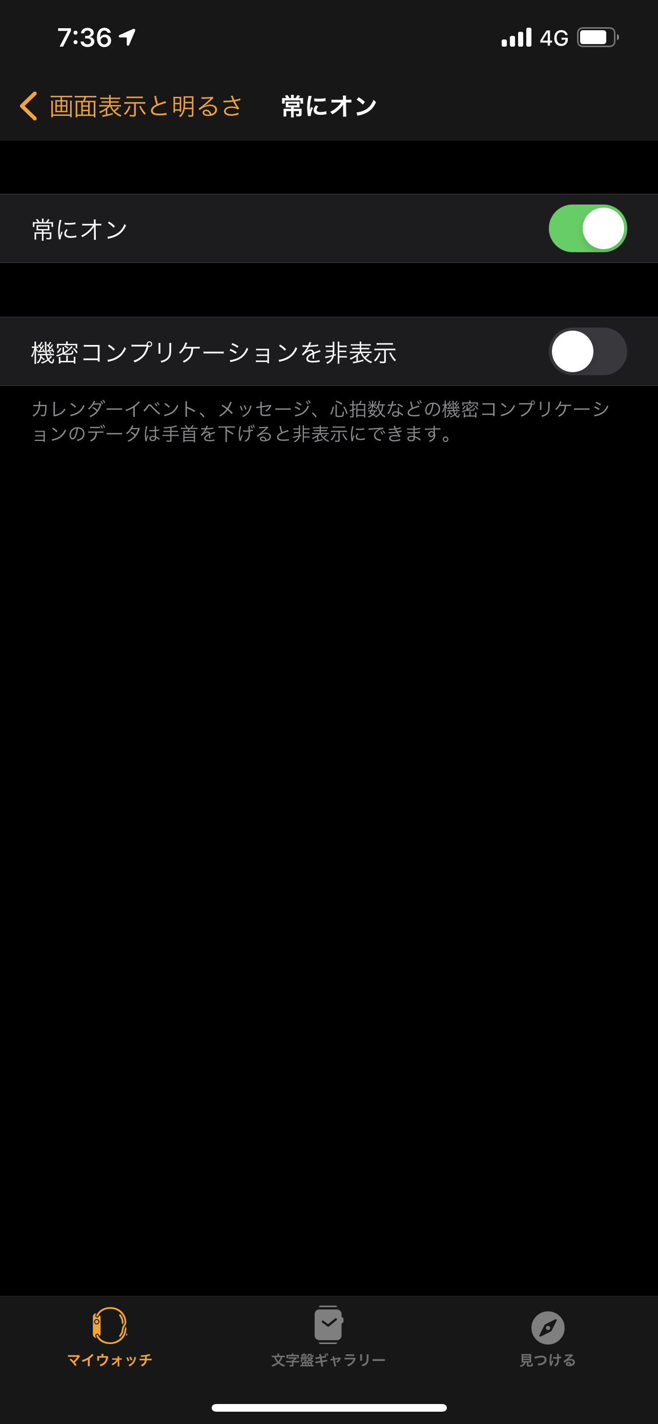 Apple Watch の series 5 以降で利用可能になった「常時表示」の機能は、通常時と同じ情報内容が常に表示されるものでない点はご留意ください。