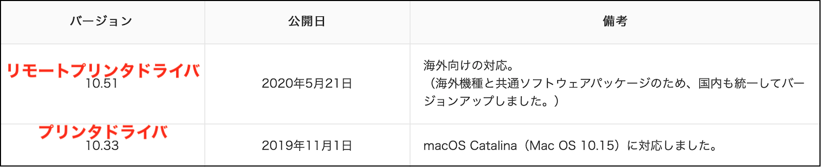 エプソンのサイトで確認して見ると、下の画像の様に、現在(2020 年 12 月 6 日時点)リリースされているプリンタドライバは、macOS Catalina(10.15.x)対応の「10.33」 までで、macOS Big Sur(11.0.x)がリリースされる約半年前にリリースされた「10.51」は、macOS Big Sur(11.0.x)対応とは言え、プリンタドライバではなくリモートプリンタドライバ です。