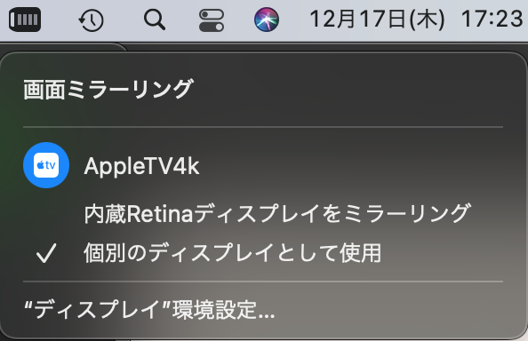 ・macbook(2017)Big Sur(11.1) + AppleTV4k(tvOS14.3) AirPlayでのミラーリング表示は問題なく利用可能