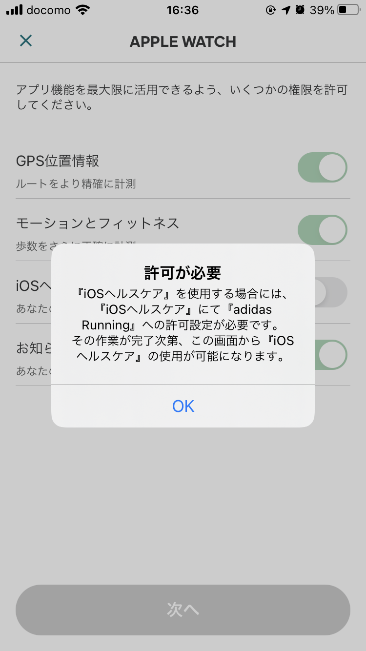 iPhone内のadidas runingもApple Watchの設定がグレーアウトしたままで、