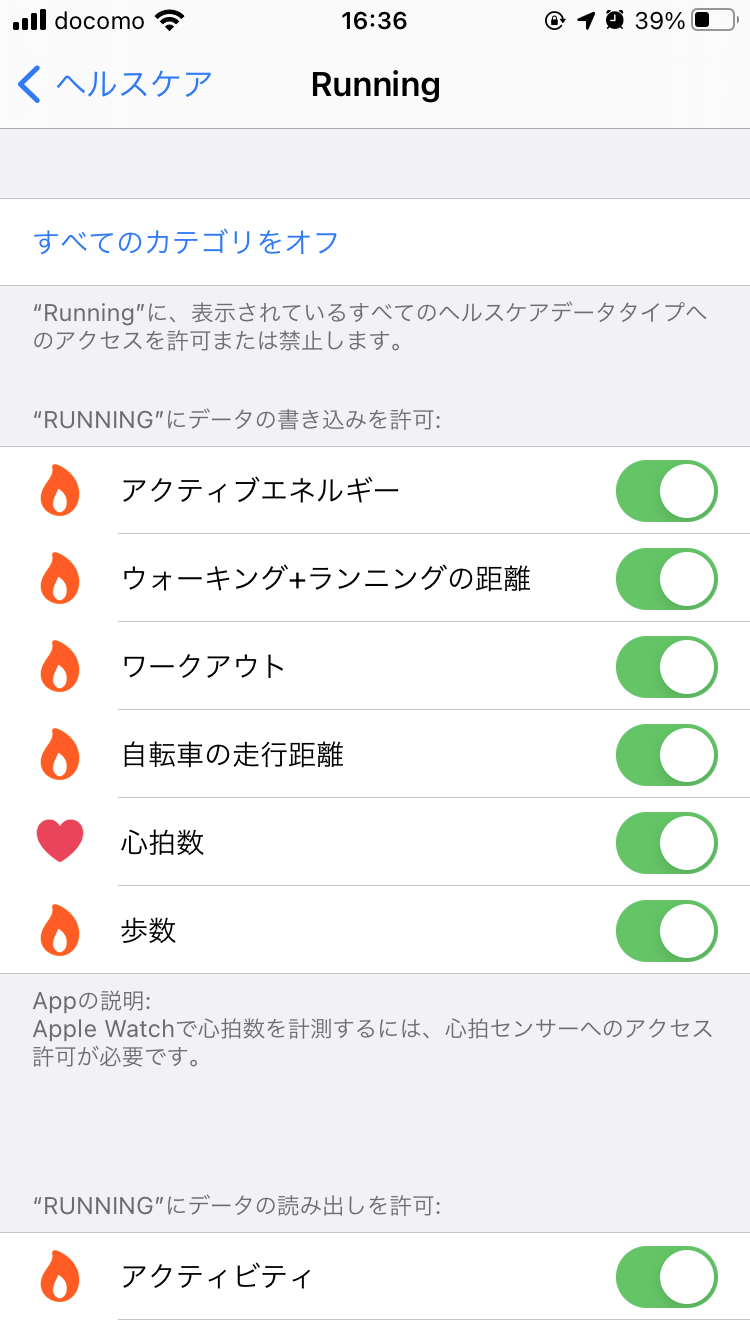 プライバシー内の位置情報サービスも、ヘルスケア内のRunningに全てのカテゴリを許可にしていますが表示が消えず、ウォッチには質問者さんと同じメッセージが表示されたままです。