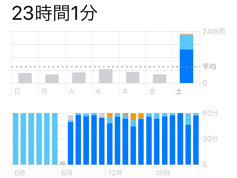 0〜6時の水色のラインは画面オフの状態で使われている状況(バックグラウンドで使われている)です