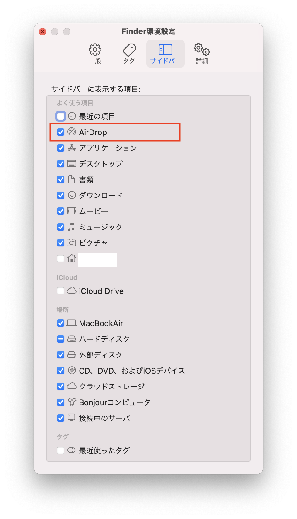 Finderウインドウのサイドバーに AirDrop が表示されません