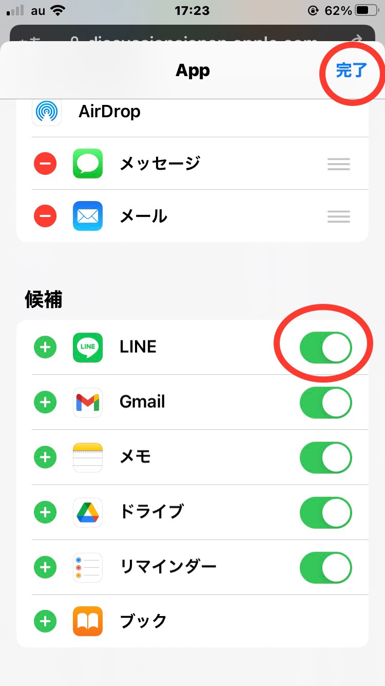 iPhone、iPad、iPod touch などの iOS デバイスで Safari の共有機能使用時に LINE App が表示されないということですね。