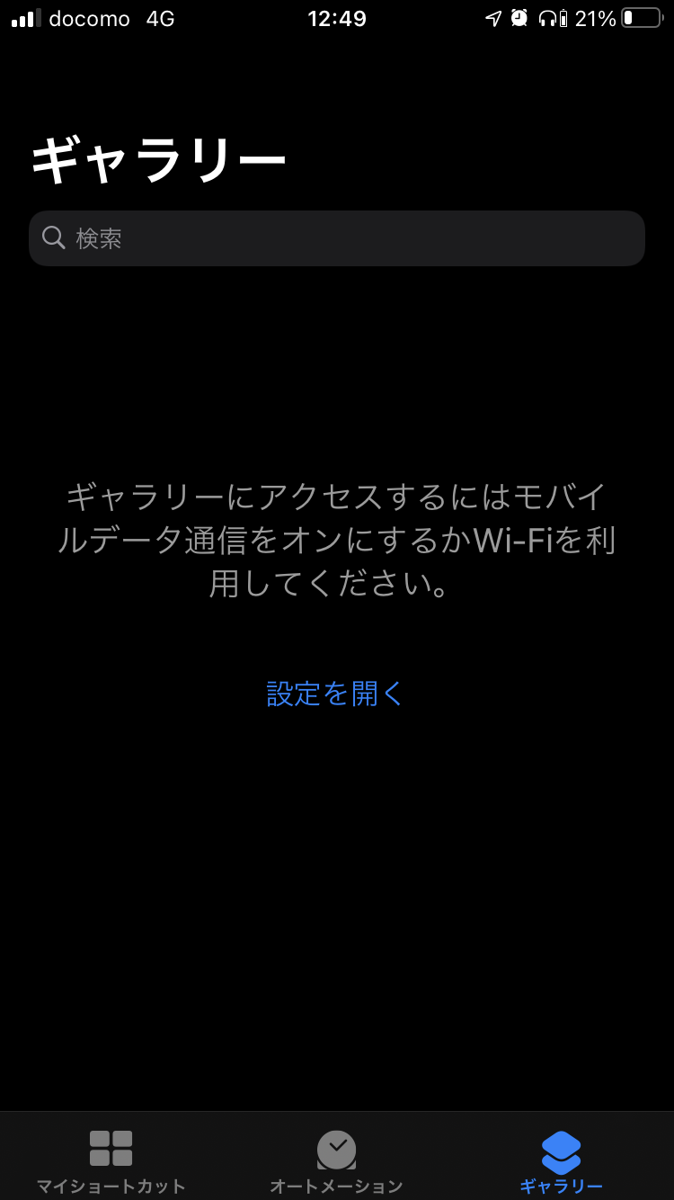 『モバイルデータ通信をオンにするかWi-Fiを利用してください』と表示され、ショートカットアプリのギャラリーにアクセスできません。