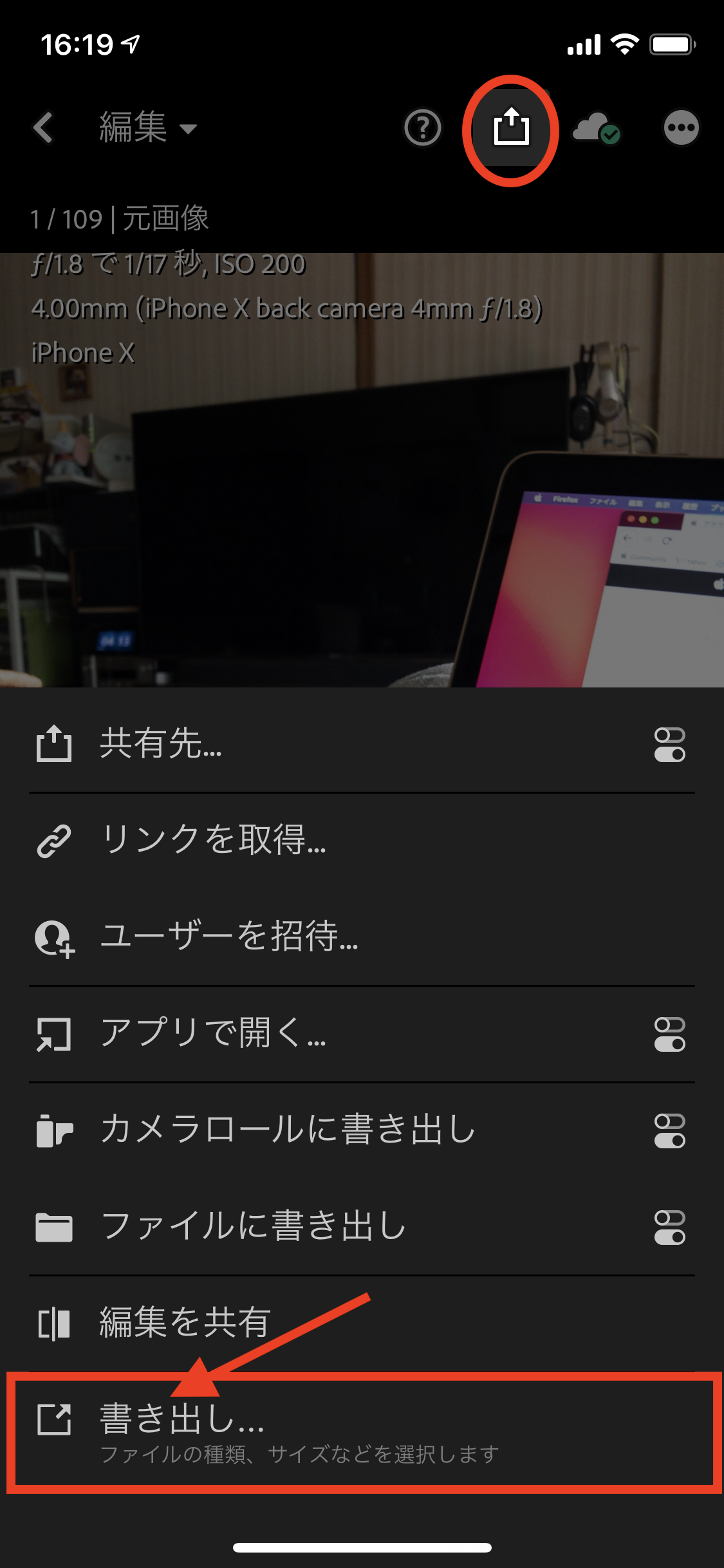 ※ 上の”カメラロールに書き出し”や”ファイルに書き出し”を使うと、強制的にJPEGに変換されてしまいます。