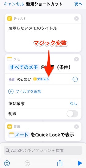 ショートカットアプリでメモアプリ内の特定のメモを表示したい